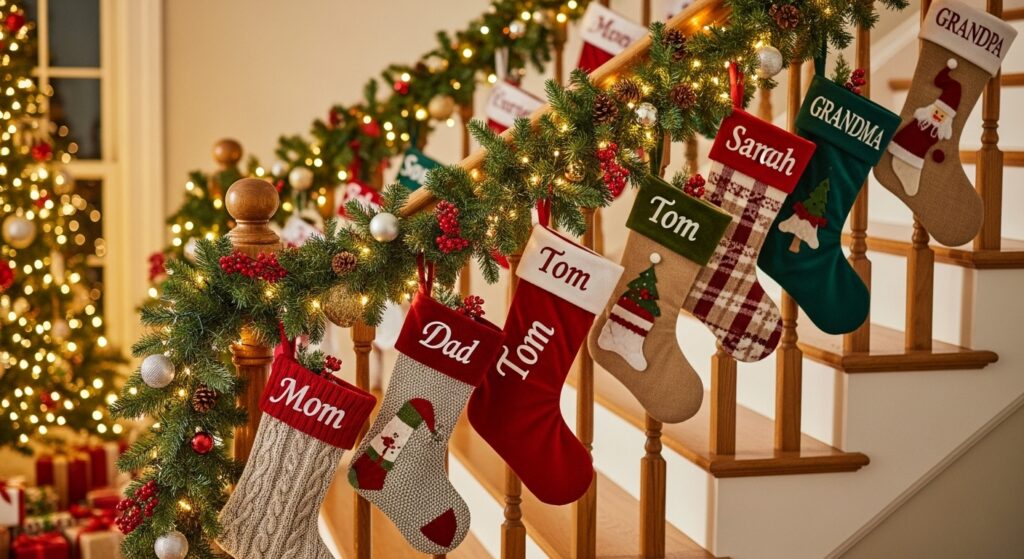 Les chaussettes de Noël insufflent douceur, tradition et émotions. Placées sur l’escalier, elles racontent une histoire familiale.