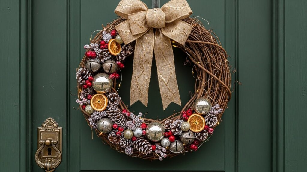 Une couronne vintage crée une entrée chaleureuse et festive. Utilisez des matières naturelles comme les pommes de pin, les baies ou les oranges séchées.