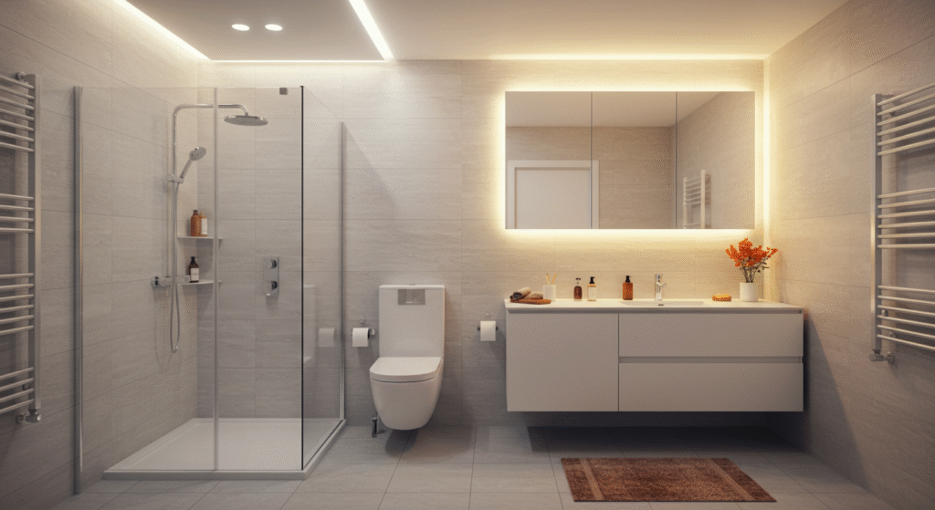Chauffage au sol, miroirs LED, robinets sans contact ou thermostats programmables optimisent confort et efficacité.