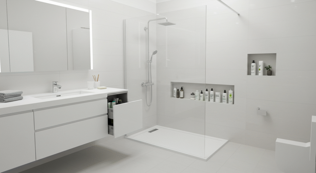 Intégrez des rangements dissimulés comme des armoires miroir, tiroirs sous vasque ou niches murales.