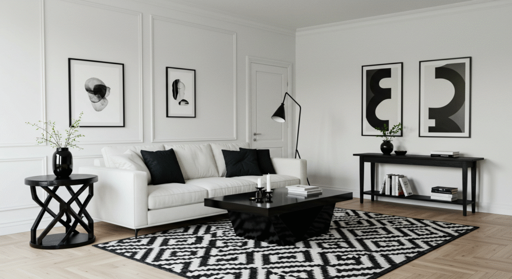Choisissez des cadres noirs, des lampes métalliques ou une table basse mate.