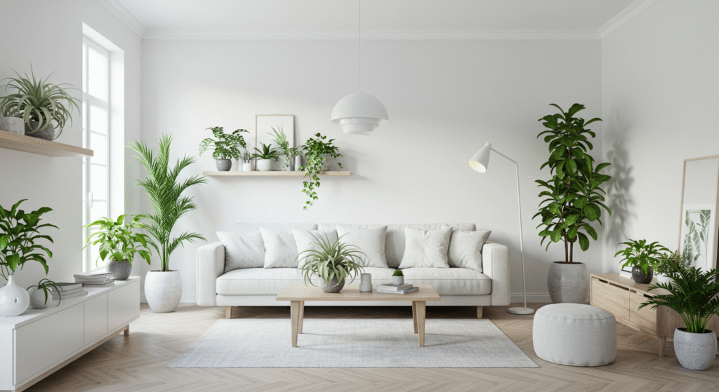 Les plantes insufflent de l’énergie et de la vitalité dans un salon blanc.