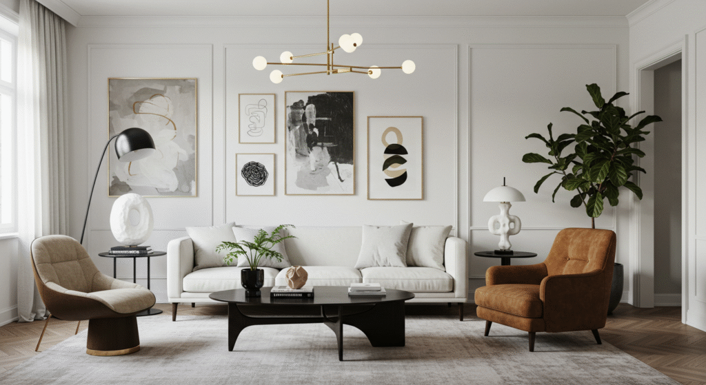 L’art transforme un salon blanc en un espace élégant et personnalisé.