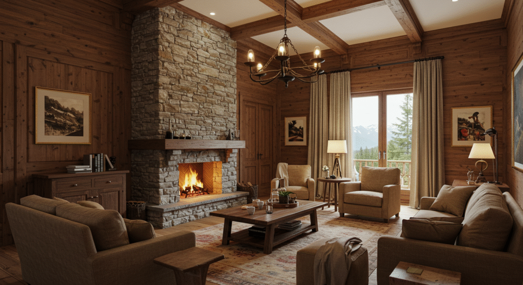 Une cheminée en pierre apporte du charme rustique et un équilibre naturel aux intérieurs en bois.