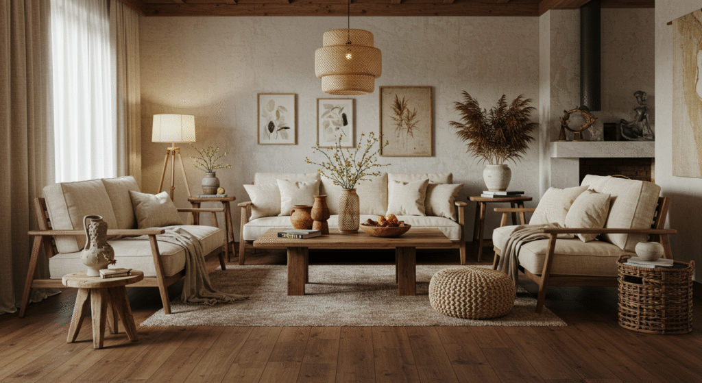 Ajoutez des paniers tressés et des tapis naturels pour une touche harmonieuse.