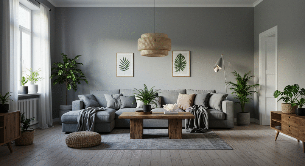 Les détails personnels transforment un salon gris en lieu de vie.