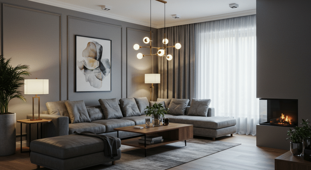 L’éclairage transforme totalement un salon gris.