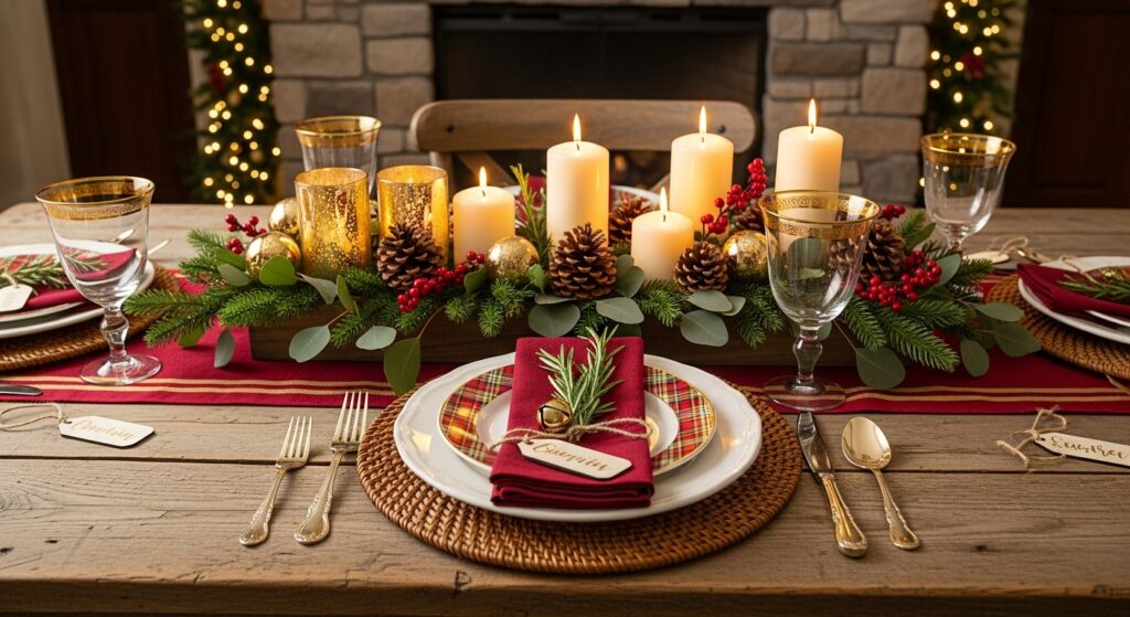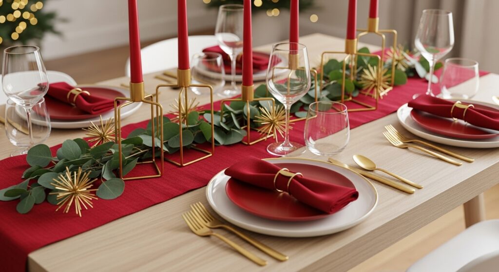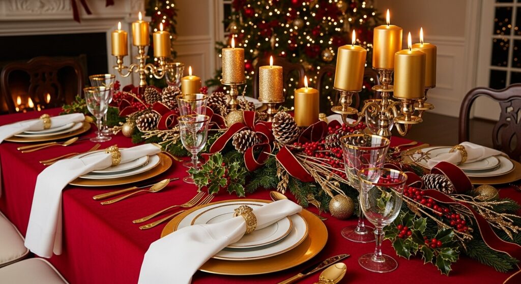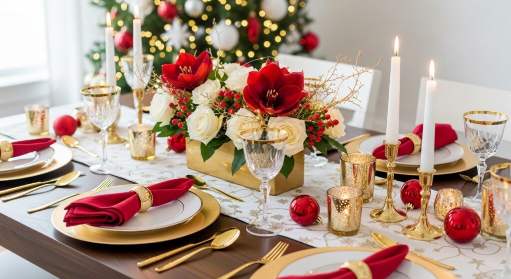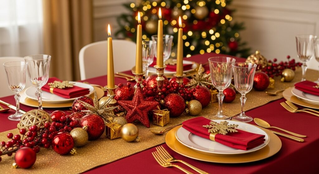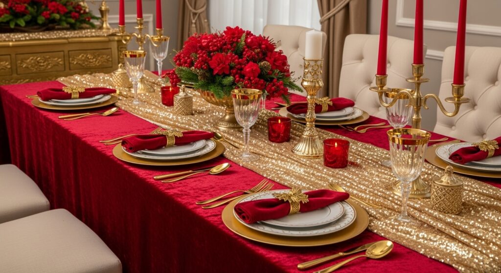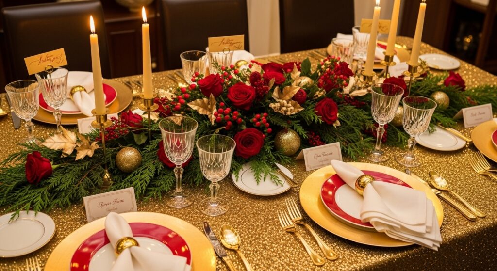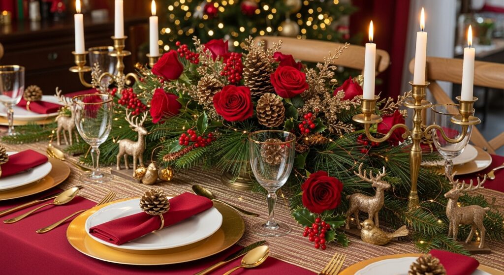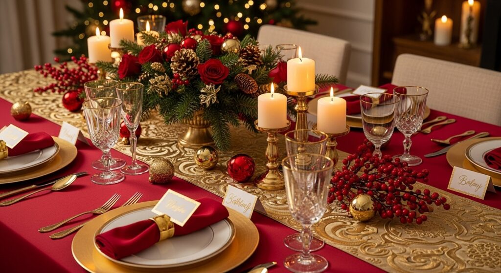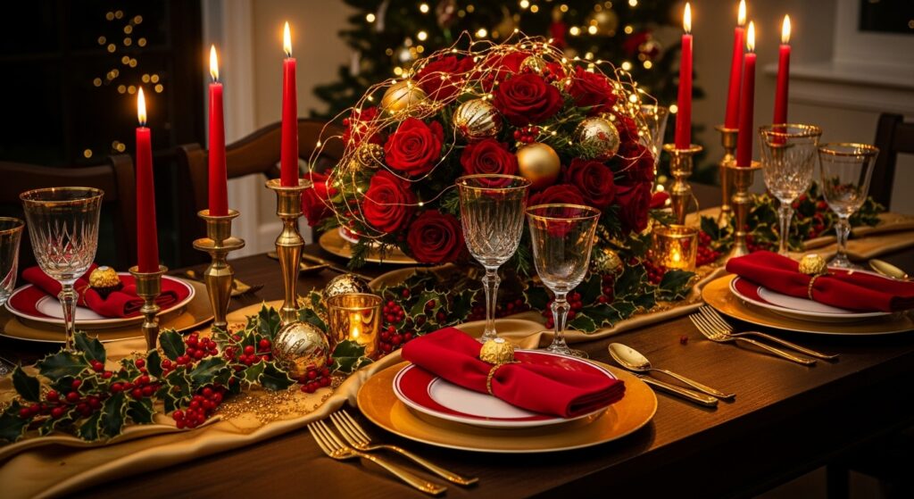 Complétez avec un centre de table composé de roses rouges, de bougies et de décorations dorées. Cette mise en scène est à la fois chaleureuse et majestueuse — idéale pour un repas familial ou un dîner chic.